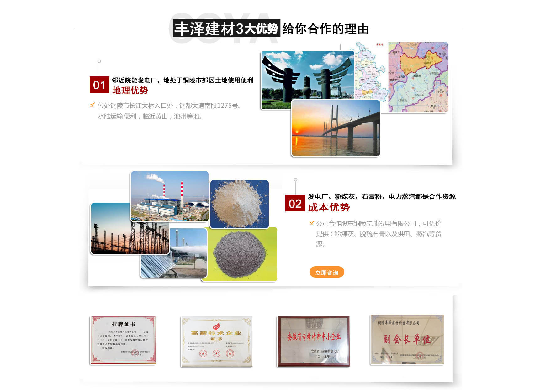 銅陵豐澤建材科技有限公司成立于2007年2月,坐落于銅都大道南段,占地4萬平方米,公司注冊(cè)資金1000萬元,現(xiàn)有職工百余人,是一家與皖能發(fā)電公司合作,專業(yè)從事電廠粉煤灰開發(fā)利用的高新科技企業(yè),現(xiàn)擁有一條年產(chǎn)30萬立方米蒸壓加氣混凝土全自動(dòng)生產(chǎn)線。 蒸壓加氣混領(lǐng)土(英文名Autoclaved aerated comcrete),也稱AAC,是以砂、粉煤灰等硅質(zhì)材料和石灰、水泥等鈣質(zhì)材料為主要原料,摻加鋁粉為發(fā)氣劑,進(jìn)行生產(chǎn)的新型墻體材料。是我國(guó)推廣應(yīng)用最早,使用最廣泛,技術(shù)最完整的輕質(zhì)保溫墻體材料之一,自問世以來,始終方興未艾,備受推崇。